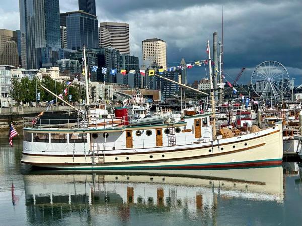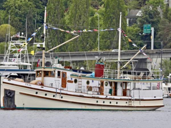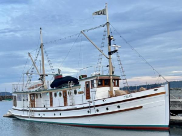 Commissioned and built as a U.S. Government Bureau of Fisheries coastal patrol vessel, TEAL was built at Kruse and Banks Shipbuilding in North Bend, Oregon (Coos Bay) and launched July 13, 1927. Her original 180 hp Washington-Estep direct reversing engine has been replaced with a 350 hp Cummins 855 NTA "Big Cam" marine diesel engine, with a Twin-Disc model 514 reverse gear at 6.5:1 reduction.